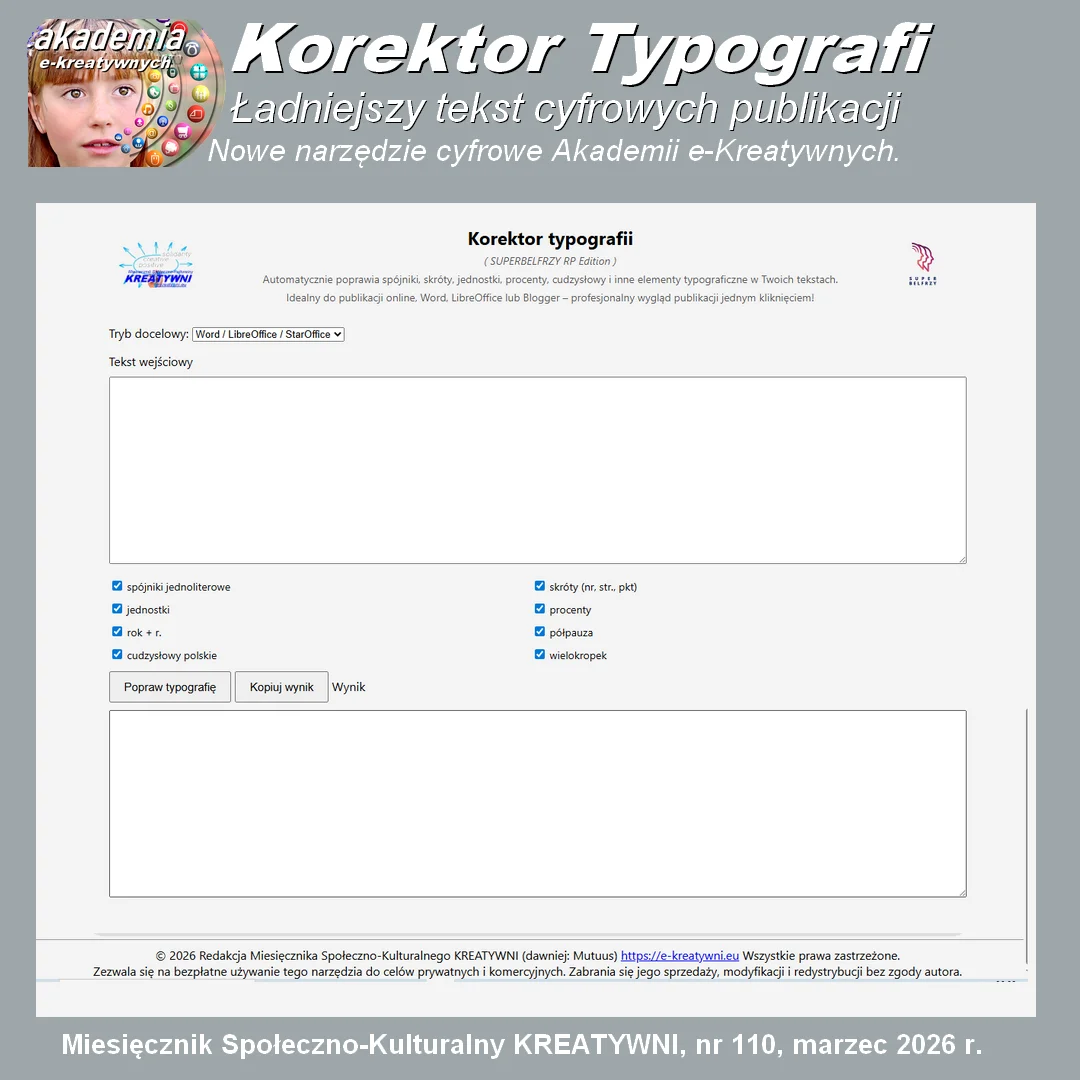 Coraz więcej kreatywnych osób publikuje swoje dokumenty w sieci. Aby wyglądały one ładnie podobnie jak papierowej wersji drukowanej to muszą spełniać określone warunki typograficzne. W naszej redakcji już wcześniej zbudowaliśmy różne małe narzędzia ..ułatwiacze'' wyglądu publikacji cyfrowych szczególnie dla eliminacji brzydko wyglądających tzw. ,,sierot'' typograficznych, a więc pojedynczych znaków wiszących na końcu linii łamanego akapitu. Dla dokumentów cyfrowych sytuacja jest trudniejsza niż dla drukowanych. Współczesne edytory tekstu umożliwiają zabezpieczenie tworzonego dokumentu przed sierotami przy pomocy tak zwanej ,,niełamliwej spacji'' (w większości edytorów tekstu można ją wstawić w tekst sekwencją klawiszy: CTRL+SCHIFT+ SPACJA ) Dla tekstu cyfrowego wyświetlanego na różnej szerokości wyświetlaczy sprawa jest bardziej złożona. Trzeba niełamliwą spacją zabezpieczyć wszystkie pojedyncze znaki, bo nigdy nie wiadomo w jakim miejscu na wyświetlaczu tekstu przypadnie złamanie linii akapitu. Ponieważ w różnych cyfrowych narzędziach publikacji różnie kodowana jest niełamliwa spacja dlatego wcześniej przygotowaliśmy szereg małych narzędzi cyfrowych wspomagających eliminację ,,sierot'' w tekście cyfrowym.