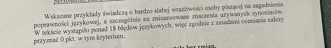 - Wskazane przykłady świadczą o bardzo słabej wrażliwości osoby piszącej na zagadnienia poprawności językowej, a szczególnie na zniuansowane znaczenia używanych synonimów. W tekście wystąpiło ponad 18 błędów językowych, więc zgodnie z zasadami oceniania należy przyznać 0 pkt. w tym kryterium - to jest dosłowny cytat przypieczętowany pieczęcią OKE. Oczywiście, jeśli chodzi o idiotyczne kryteria oceniania na poziomie rozszerzonym z języka polskiego - to ta liczba błędów językowych się zgadza.