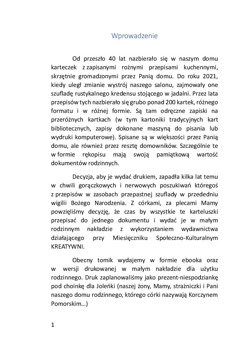 Decyzja, aby je wydać drukiem, zapadła kilka lat temu w chwili gorączkowych i nerwowych poszukiwań któregoś z przepisów w zasobach przepastnej szuflady w przededniu wigilii Bożego Narodzenia. Z córkami, za plecami Mamy powzięliśmy decyzję, że czas by wszystkie te karteluszki przepisać do jednego dokumentu i wydać je w małym rodzinnym nakładzie z wykorzystaniem wydawnictwa działającego przy Miesięczniku Społeczno-Kulturalnym KREATYWNI.
