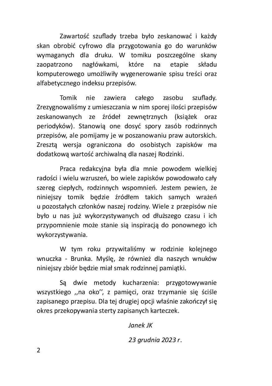 Praca redakcyjna była dla mnie powodem wielkiej radości i wielu wzruszeń, bo wiele zapisków powodowało cały szereg ciepłych, rodzinnych wspomnień. Jestem pewien, że niniejszy tomik będzie źródłem takich samych wrażeń u pozostałych członków naszej rodziny. Wiele z przepisów nie było u nas już wykorzystywanych od dłuższego czasu i ich przypomnienie może stanie sią inspiracją do ponownego ich wykorzystywania.