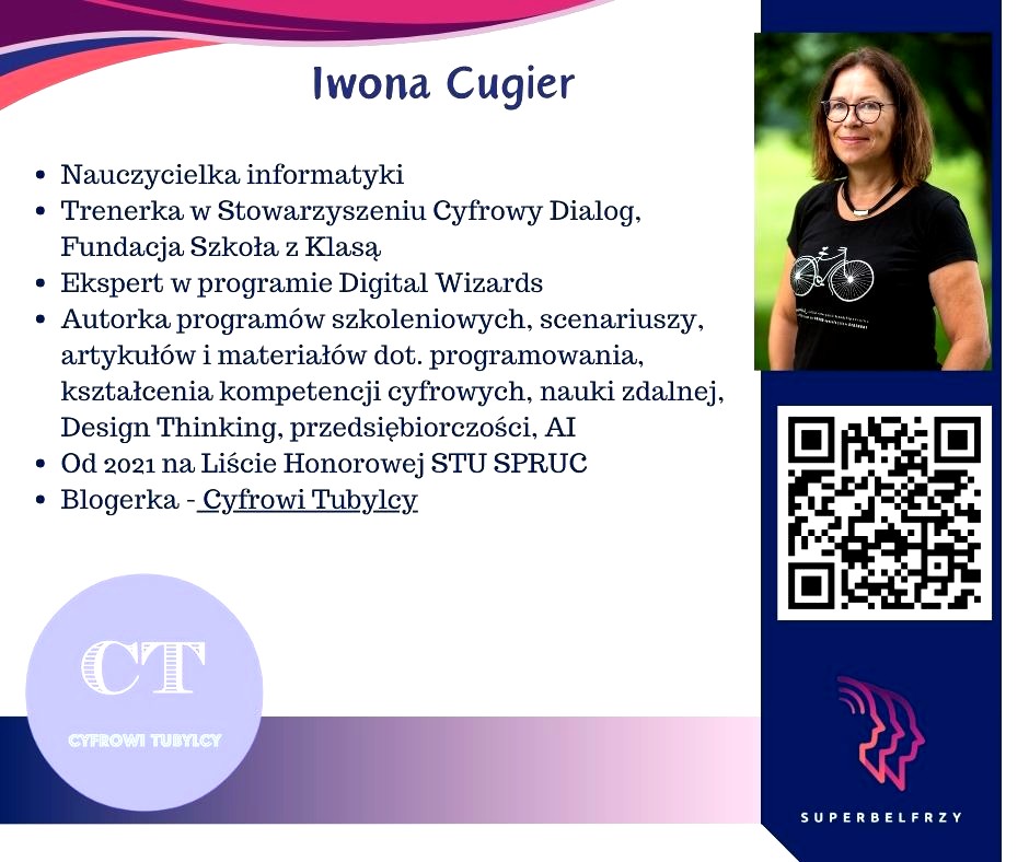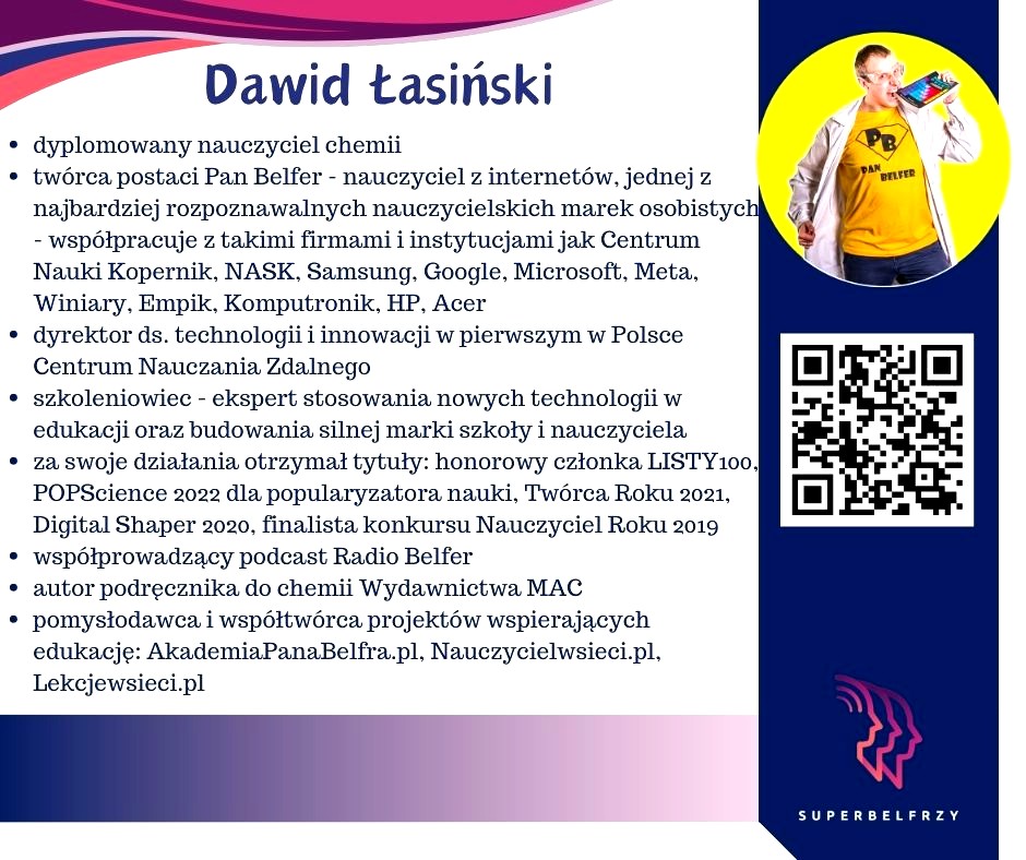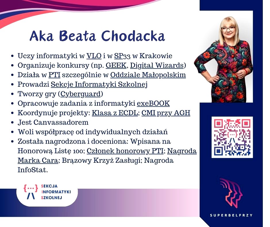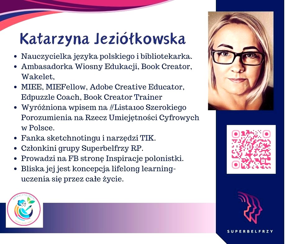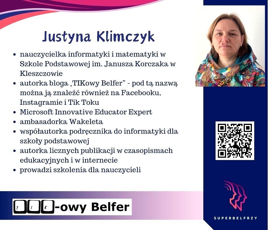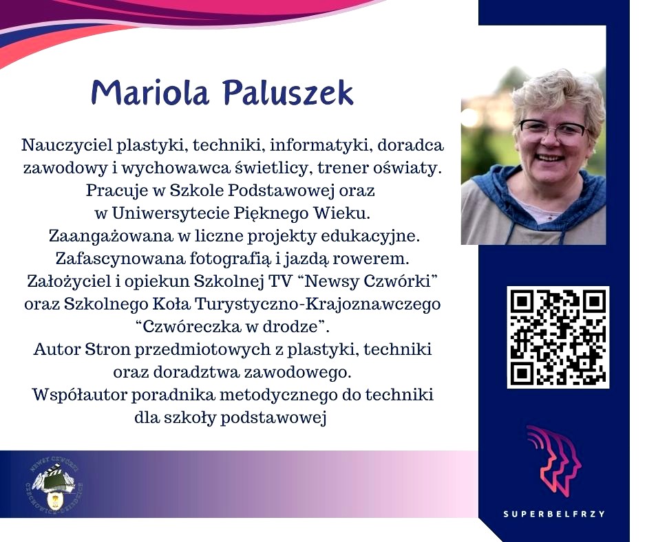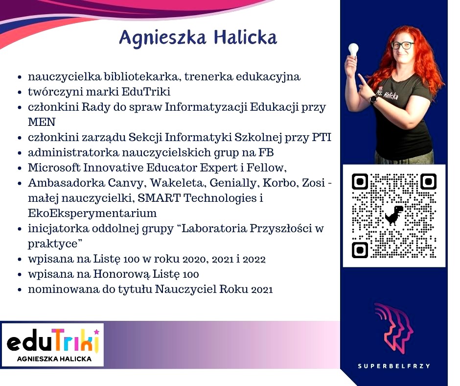 W tym roku w Canvie potworzyliśmy swoje wizytówki,, gdzie każdy przedstawiał się kim jest i co robi oraz umieścił kod QR, który odsyła do zasobów sieciowych nim związanych.