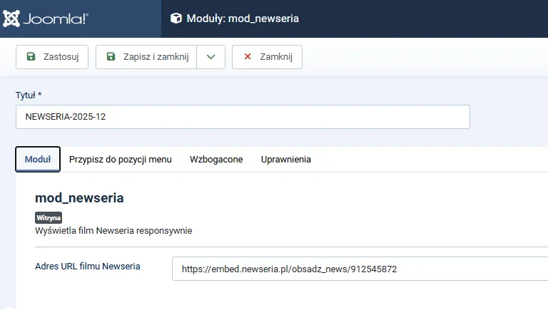 Dla każdego takiego filmu rejestrujemy panelu redakcyjnym nową instancję naszego modułu o nazwie: "mod_newseria" i wklejamy go do treści naszego artykułu z poziomu menu edytora treści: |Treść CMS==>Module.
