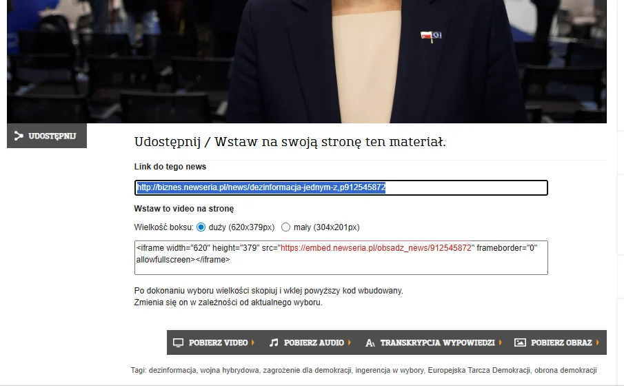 Agencja NEWSERIA udostępnia kod umożliwiające wklejenie filmu na własną stronę ale w wersji staycznej z dwoma wielkościami wyświetlacza do wyboru: zob. ilustracja poniżej: